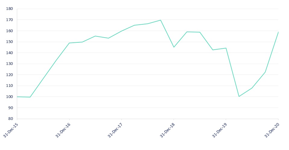 | 31-Dec-20 | 133.57 | 29.89% | 10.39% |